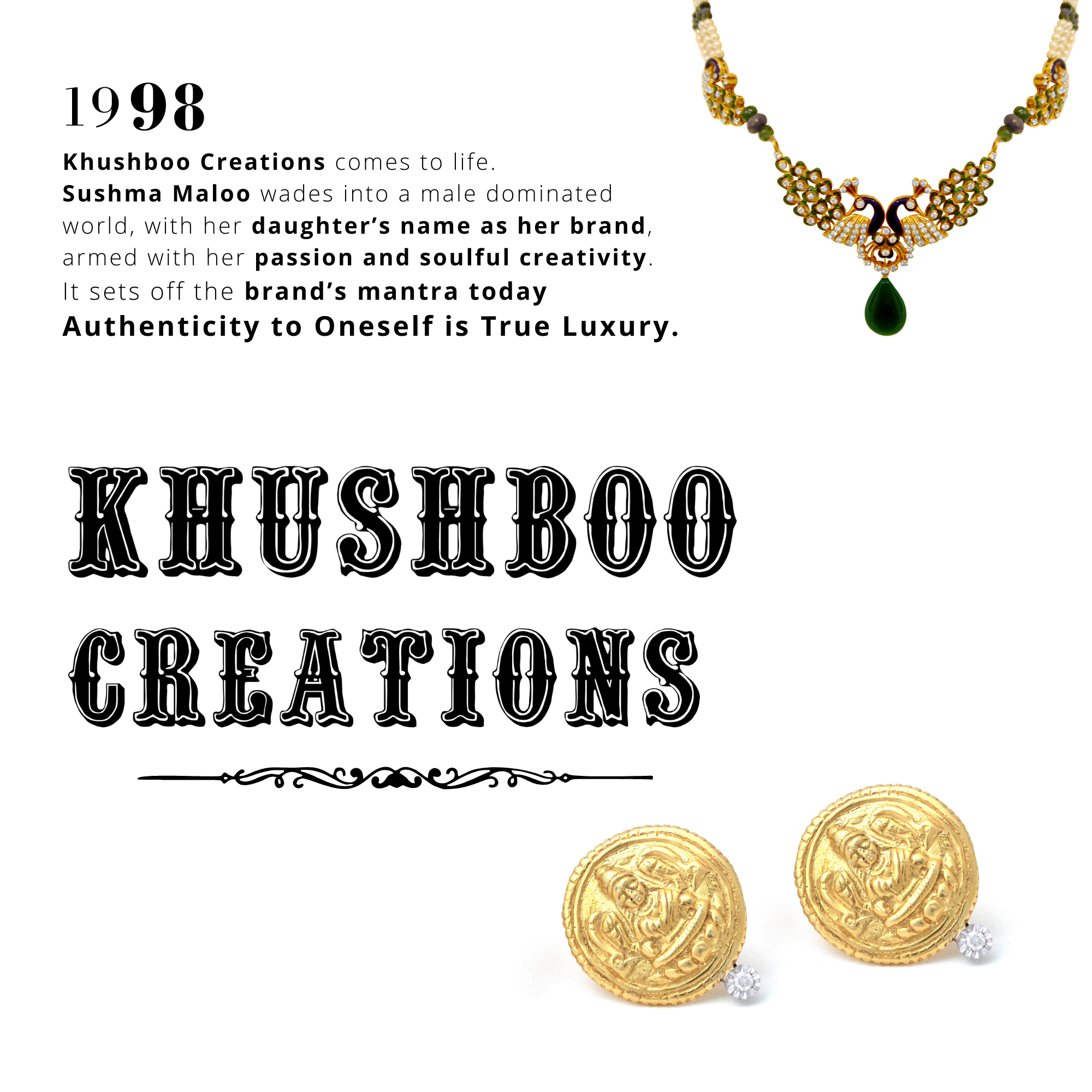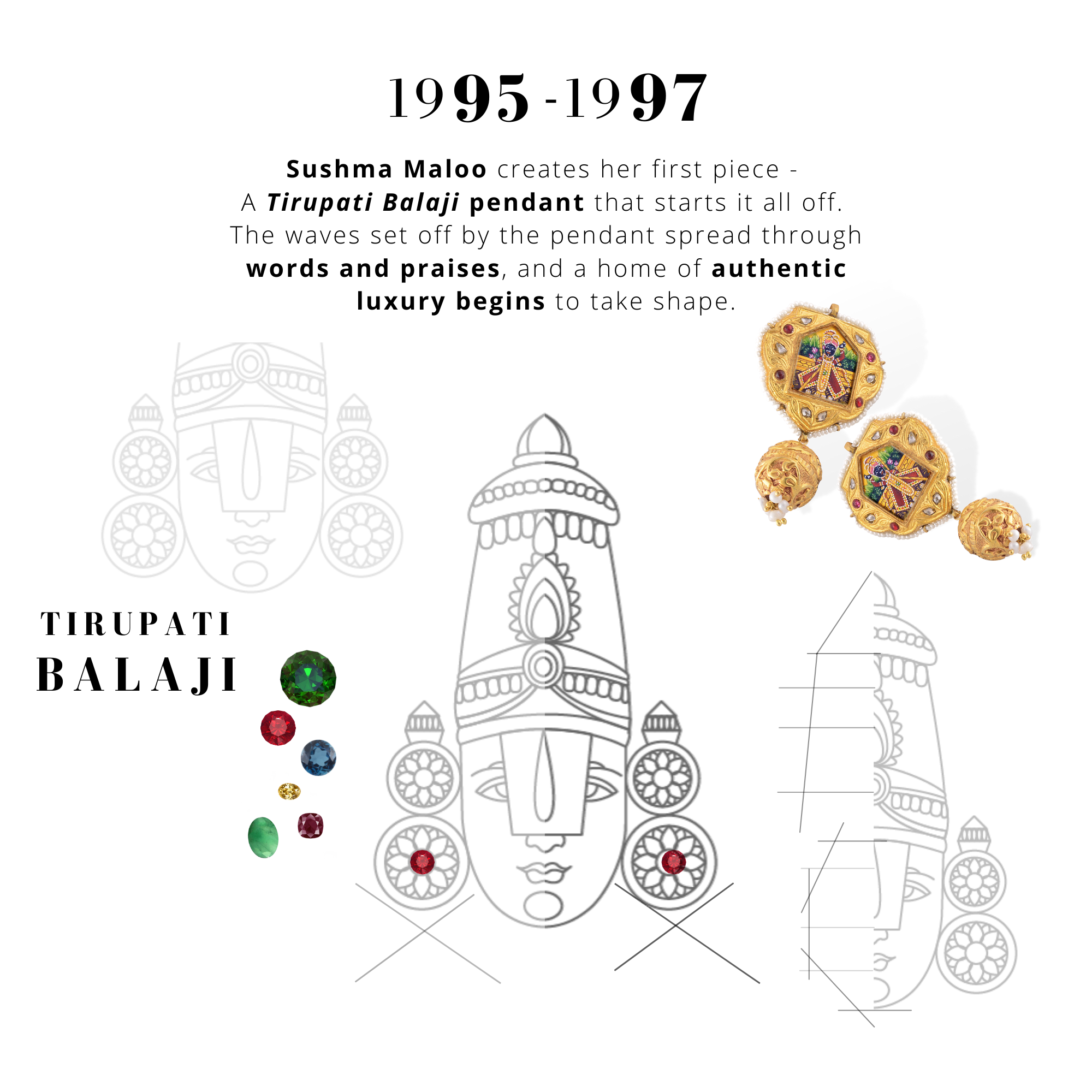 Mrs Sushma Maloo creates her first piece- A Tirupati Balaji pendant that starts it all. The waves set off by the pendant spread through words and praises, and a home of authentic luxury begins to take shape.