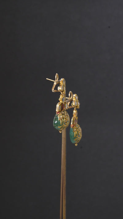 These earrings feature a cascade of floral kundan clusters that lead gracefully to an emerald green enamel drop, hand-painted with intricate gold Tanjore-style motifs. A touch of red Meenakari at the neck adds a regal accent, while the pear-shaped silhouette evokes classical Indian design.