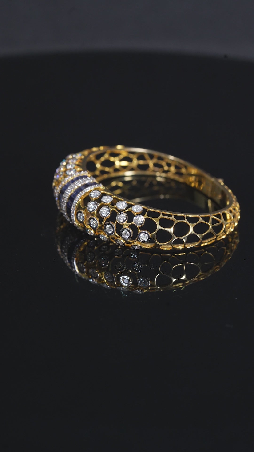 The Seréna Regal Bangle is a masterpiece of sculptural artistry and timeless allure. Fashioned in lustrous 18K gold with an intricate honeycomb lattice, this bangle radiates opulence. The bold centerpiece features twin rows of deep sapphire baguettes flanked by brilliant-cut diamonds, evoking regal sophistication. Each bezel-set diamond along the curved silhouette adds a luminous sparkle, making this piece a perfect fusion of architectural design and classic glamour—a statement jewel for the discerning connoisseur.