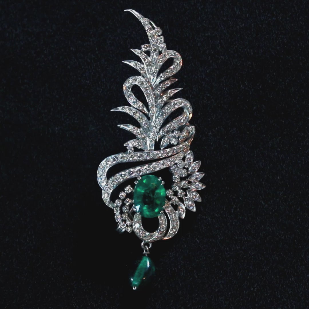 This exquisite brooch evokes the elegance of a bygone era with its graceful, feathery design. Inspired by the natural beauty of a fern frond, this piece is crafted from polished platinum or white gold, its intricate curves and lines sparkling with pavé-set diamonds. At the center, a majestic oval-cut emerald serves as the focal point, its deep green hue a symbol of royalty and prosperity. A tear-drop emerald dangles delicately below, adding movement and an extra touch of regal charm. This brooch is the perfect accessory to add a touch of aristocratic splendor to any ensemble.